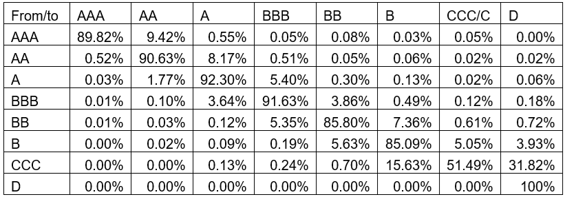 S&P average transitions from 1981-2018 (source S&P Global Default Study 2019)
