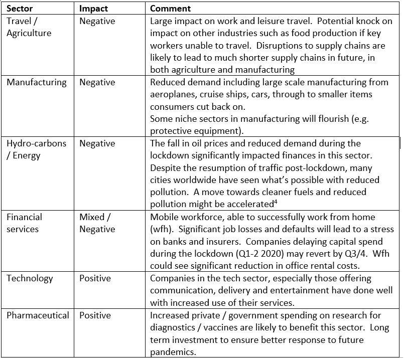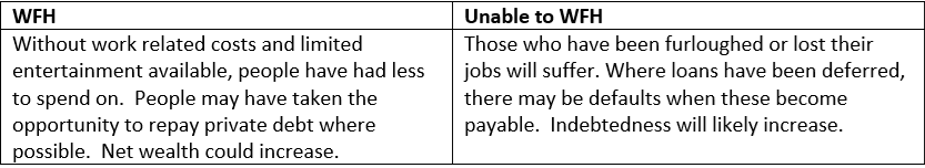 Job losses as a result of the virus and lockdown on the sectors above could significantly impact the economy. So far, this impact has been ameliorated by the governments’ generous “furlough” schemes. Consumer spending, already reduced, will reduce further as support schemes end.