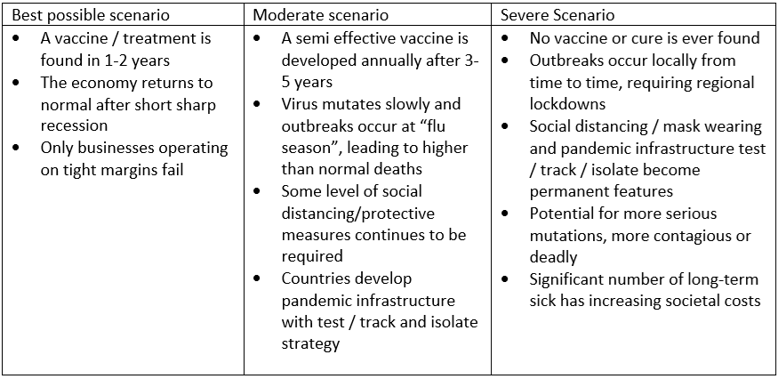 The extent of the economic impact will depend on how long Covid-19impacts last and countries’ economic outlook before the pandemic. In particular, in the UK, outcomes will likely be exacerbated by the economic impacts of Brexit. Three scenarios below emphasize a plausible range of outcomes.
